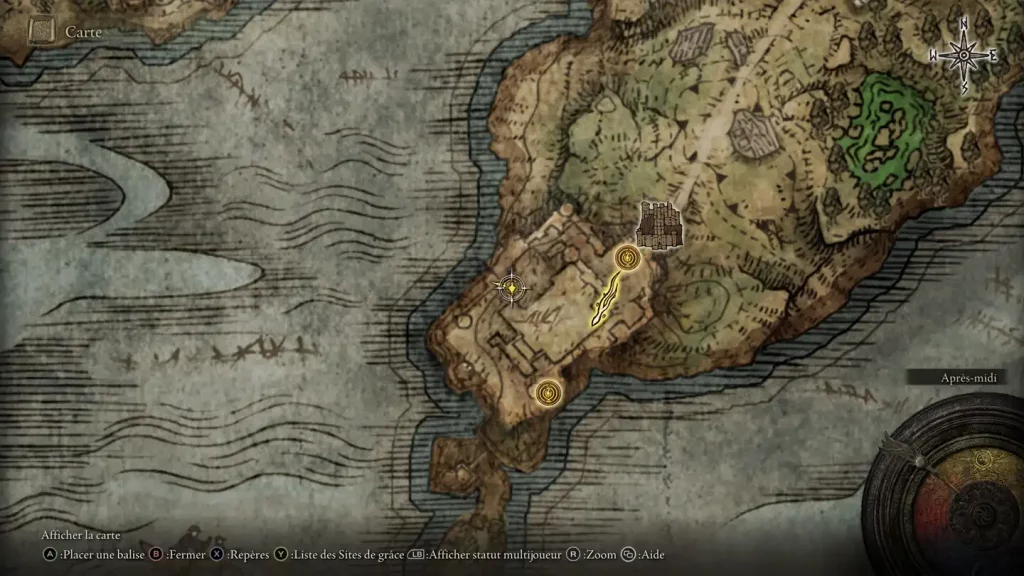 L’arène du boss se trouve sur les rives sud-ouest du château. Depuis le site de grâce « Au-delà de la geôle des remparts », dirigez-vous vers le sud-ouest en traversant un pont en bois vers une tour. L’arène du boss est clairement visible depuis cette tour.